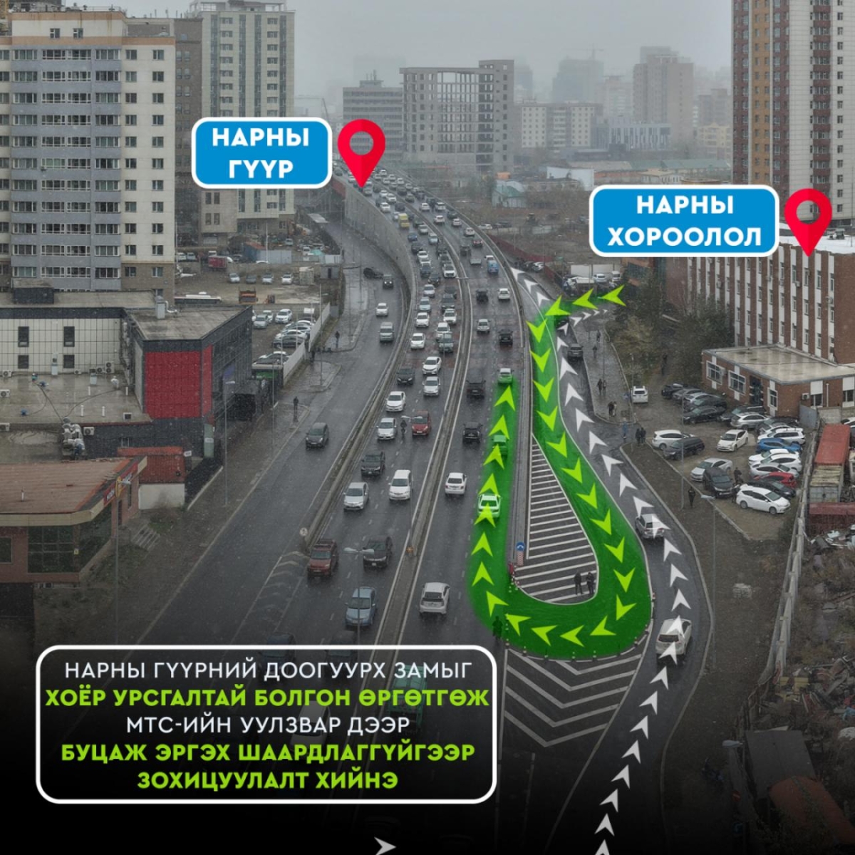 Нарны гүүрний зүүн талын нэг эгнээ замыг өргөтгөх ажил дууссан бөгөөд маргааш буюу 10-р сарын 15-наас нээнэ. Үүнтэй холбоотойгоор “Нарны хороолол” талаас ирэх жолооч нар МТС-ийн уулзвараар буцаж эргэх шаардлагагүй шууд Нарны гүүрний зүүн талаар буцаж эргэх эргэлт хийн хотын төв рүү шууд орох боломжтой.