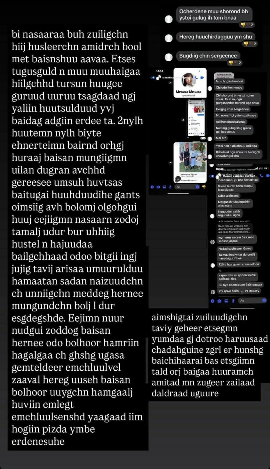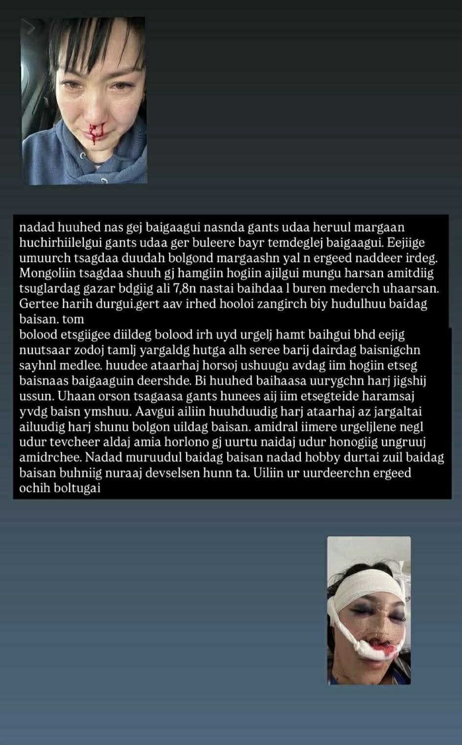 Бүх зүйлийг чинь хийж, хүслээр чинь амьдарч боол мэт байсан шүү ааваа. Эцэс төгсгөлд нь муу муухайгаа хийлгэчихээд төрсөн хүүгээ гөрөөд өөрөө цагдаад өгч, ялыг нь хөөцөлдөөд явж байдаг адгийн эр дээ та. Хоёр нялх хүүтэй минь, нялх биетэй эхнэртэй минь байранд орох гэж хурааж байсан мөнгийг маань уйлан дуугарч авчихаад гэрээсээ өмсөх хувцас байтугай, хүүхдүүдийнхээ ганц оймсыг авах боломж олгохгүй хөөсөн. Ээжийг минь насаар нь зодож, тамлаж, өдөр бүр үхэхийг хүстэл нь хажуудаа байлгачихаад одоо битгий ингэж жүжиг тавьж, арьсаа өмөөр л дөө. Хамаатан садан, найзууд чинь үнэнийг чинь мэддэг хэрнээ мөнгөнд чинь болж л дүр эсгэдэг шүү дээ. Ээжийг минь нүүр нүдгүй зоддог байсан хэрнээ одоо болохоор хамрын хагалгаа ч гэх шиг. Угаасаа гэмтэл дээр эмчлүүлвэл хэрэг үүсэх байсан болохоор таныг хамгаалж хувийн эмнэлэгт эмчлүүлсэн шүү дээ. Яагаад ийм хогийн п... юм бээ Эрдэнэсүхээ. Аймшгийн зүйлүүдийг чинь тавъя гэхээр эцэг минь юм даа гэж дотроо харуусаад чадахгүй нь ээ. Зүгээр л эр хүн шиг байчихаарай. Бас эцгийн минь талд орж байгаа хуурамч амьтад минь зүгээр зайлаад, далдраад өгөөрэй.” хэмээн бичжээ.
