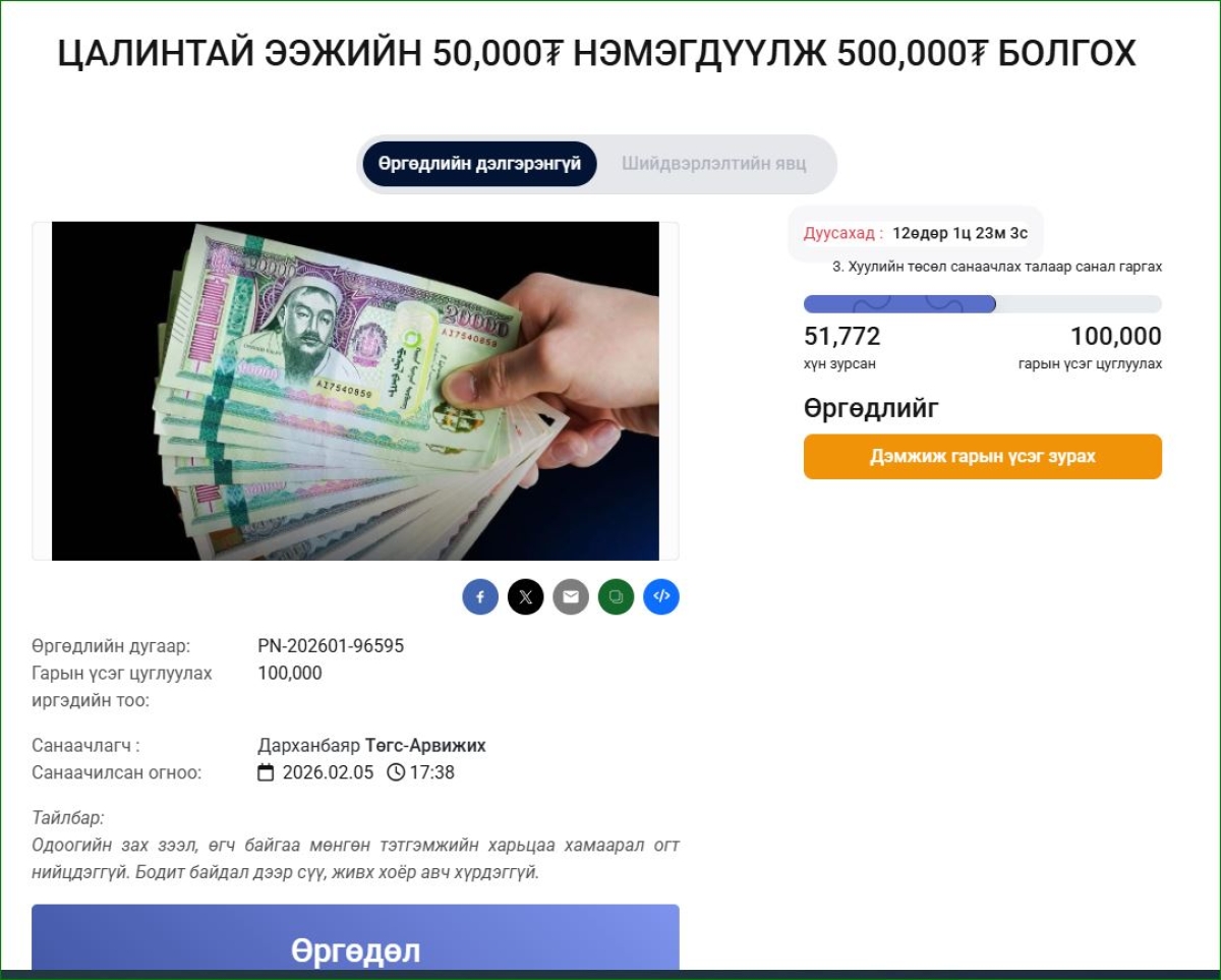 Иргэдийн санал гомдлыг хүлээн авч шийдвэрлэдэг “D.parliament”-д цалинтай ээжийн 50 мянган төгрөгийг 500 мянга болгох өргөдөл санаачилж гарын үсэг цуглуулж эхэлжээ. Тус өргөдлийг Д.Төгс-Арвижих санаачилсан бөгөөд одоогоор 50,667 иргэн гарын үсэг зурсан байна.
