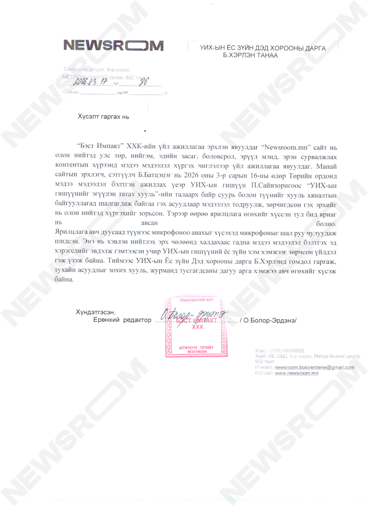 “Newsroom.mn” сайт нь олон нийтэд улс төр, нийгэм, эдийн засаг, боловсрол, эрүүл мэнд, эрэн сурвалжлах контентын хүрээнд мэдээ мэдээлэл хүргэх чиглэлээр үйл ажиллагаа явуулдаг. Манай сайтын эрхлэгч, сэтгүүлч Б.Батцэцэг нь 2026 оны 3-р сарын 16-ны өдөр Төрийн ордон мэдээ мэдээлэл бэлтгэн ажиллах үеэрээ УИХ-ын гишүүн П.Сайнзоригоос “УИХ-ын гишүүнийг эгүүлэн татах хууль”-ийн талаарх байр суурь болон түүнийг хууль хяналтын байгууллагад шалгагдаж байгаа гэх асуудлаар мэдээлэл тодруулж, зөрчигдсөн гэх эрхийг нь олон нийтэд хүргэхээр ажилласан. Тэрээр өөрөө ярилцлага өгөхийг хүссэн тул яриаг нь авсан болно. Ярилцлага авч дуусаад түүнээс микрофоноо авахыг хүсэхэд микрофоныг шал руу чулуудаж шидсэн. Энэ нь хэвлэн нийтлэх эрх чөлөөнд халдахаас гадна мэдээ мэдээлэл бэлтгэх эд хэрэгслийг эвдэлж гэмтээсэн нь УИХ-ын гишүүний ёс зүйн хэм хэмжээг зөрчсөн үйлдэл гэж үзэж байна. Тиймээс УИХ-ын Ёс Зүйн Дэд хорооны дарга Б.Хэрлэнд тухайн асуудлыг зохих хууль, журманд тусгагдсаны дагуу арга хэмжээ авч өгөхийг хүсэж, албан ёсоор гомдол гаргалаа.