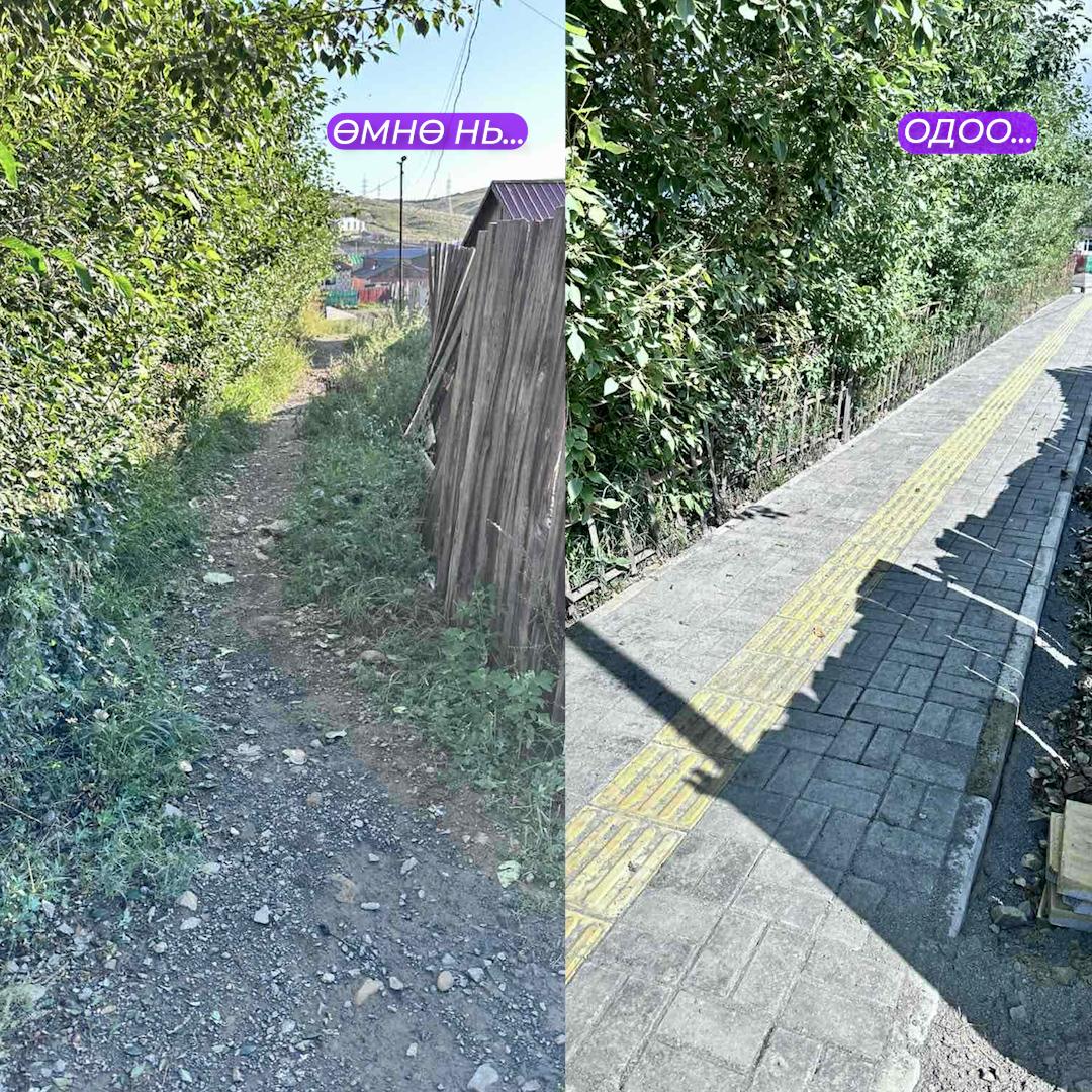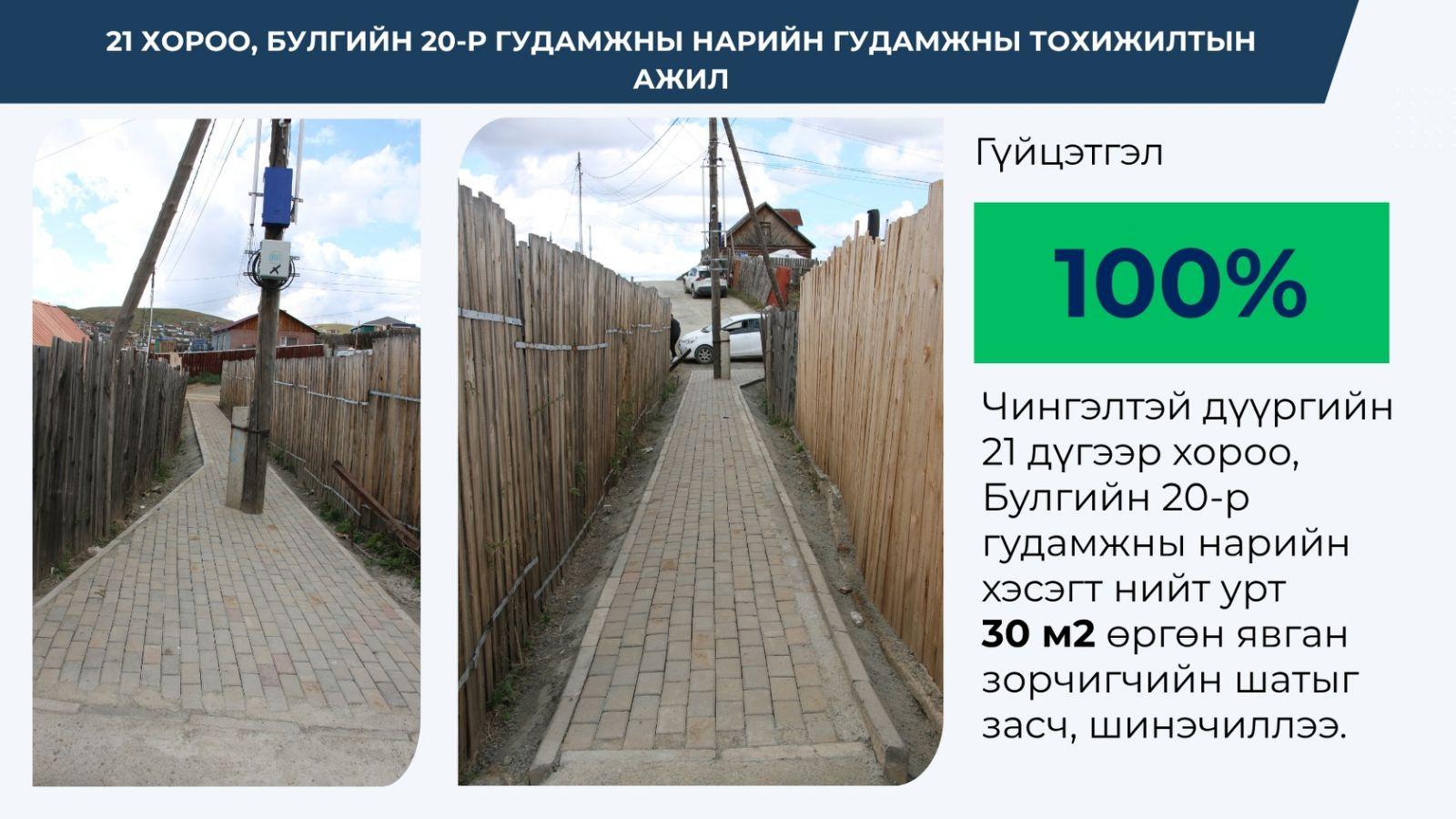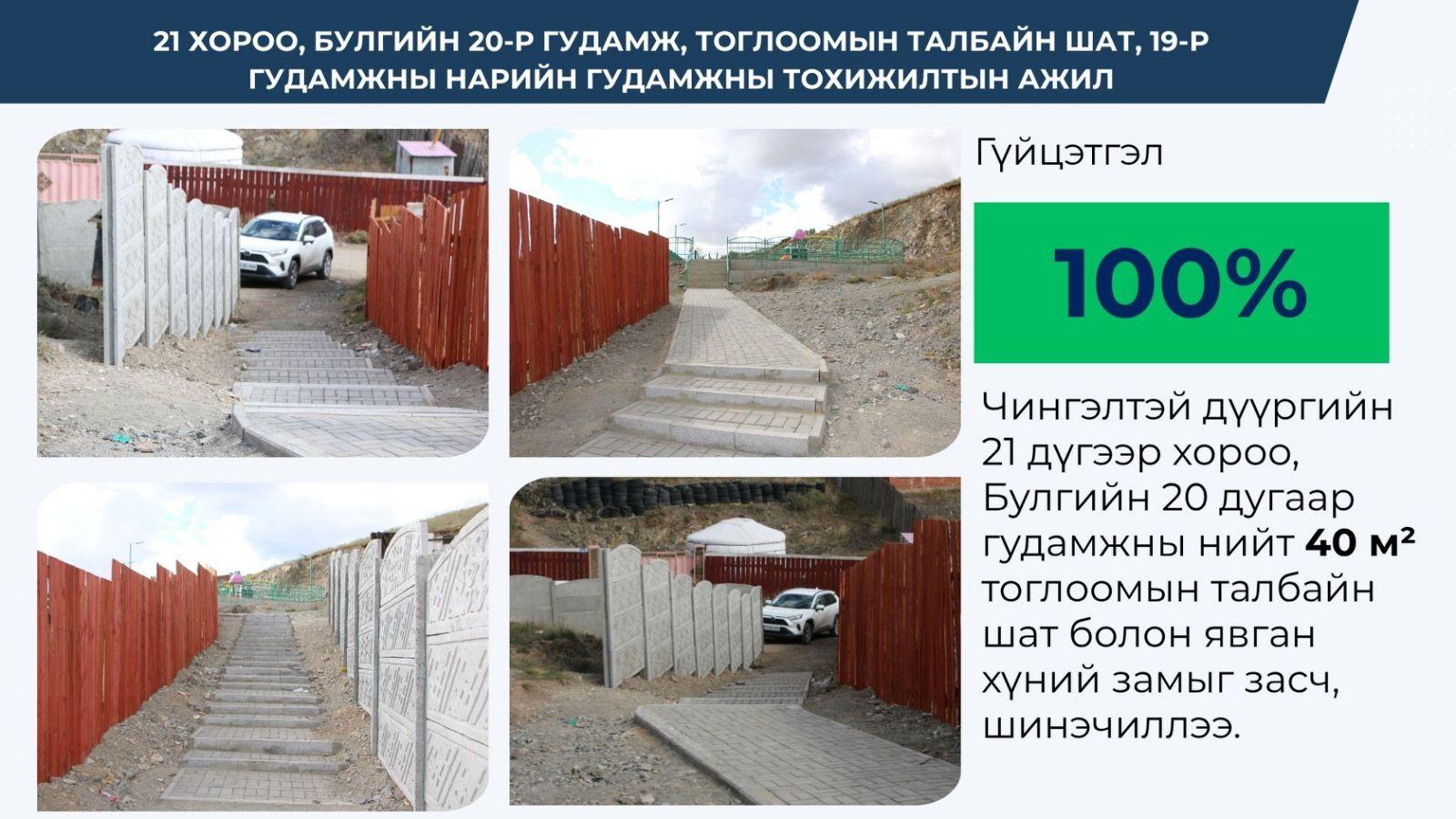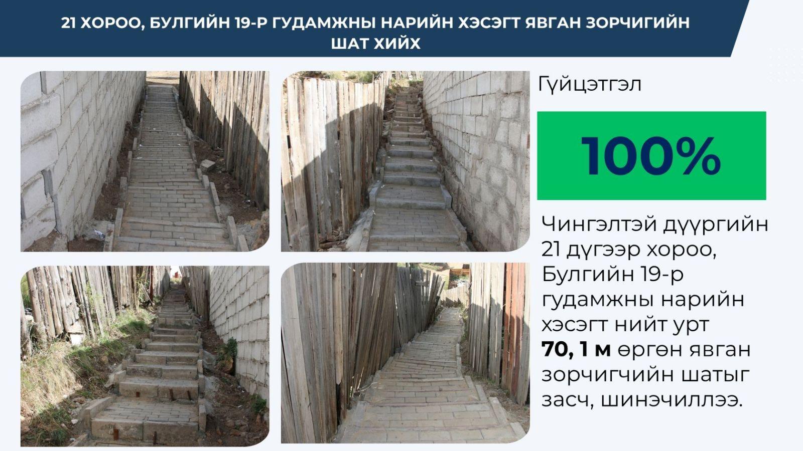Мөн 21 дүгээр хорооны зорчиход хүндрэлтэй, сул шороо, өгсүүр, уруу ихтэй байршлууд буюу Булгийн 19, 20 дугаар гудамжуудын гурван байршилд явган зам, шат хийж тохижуулсан байна.