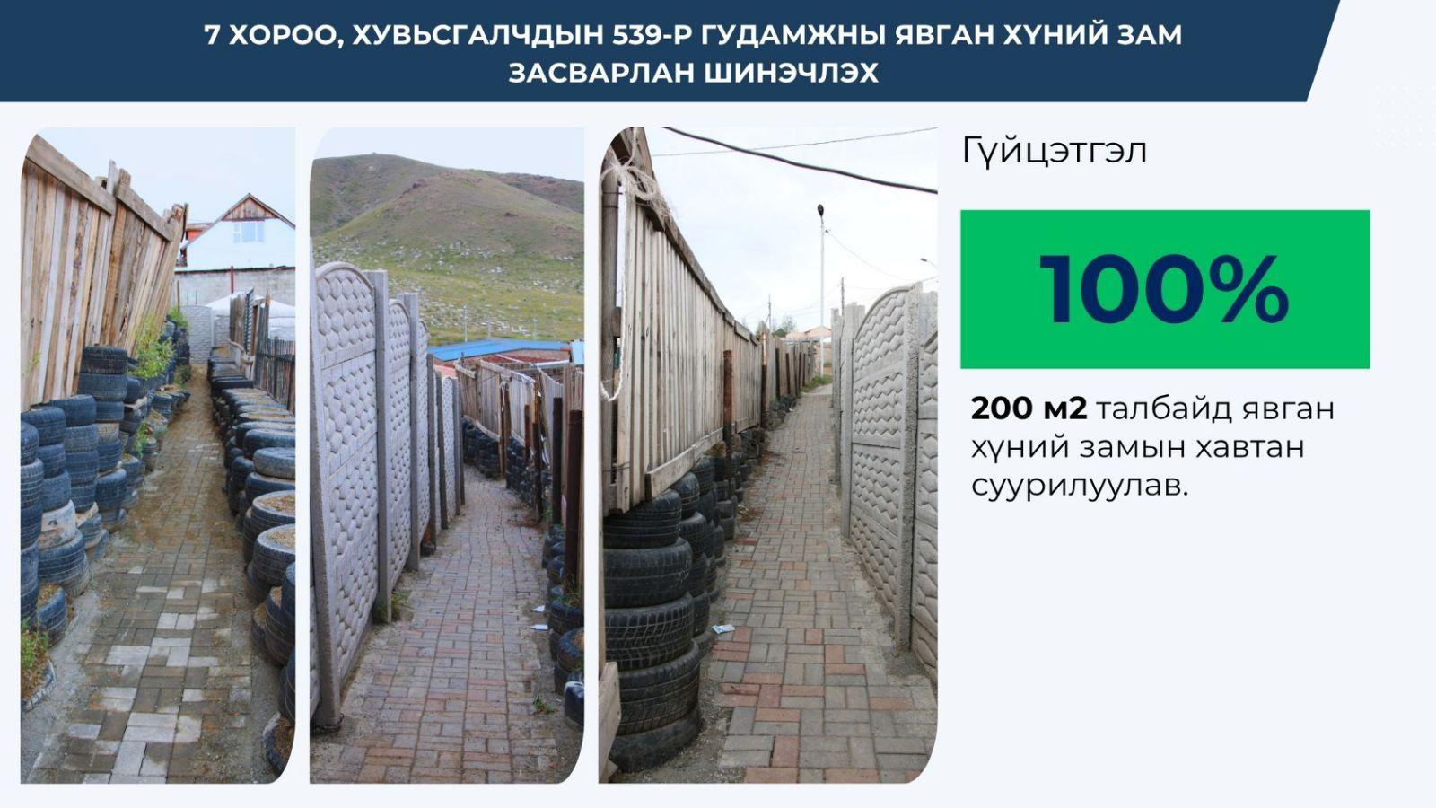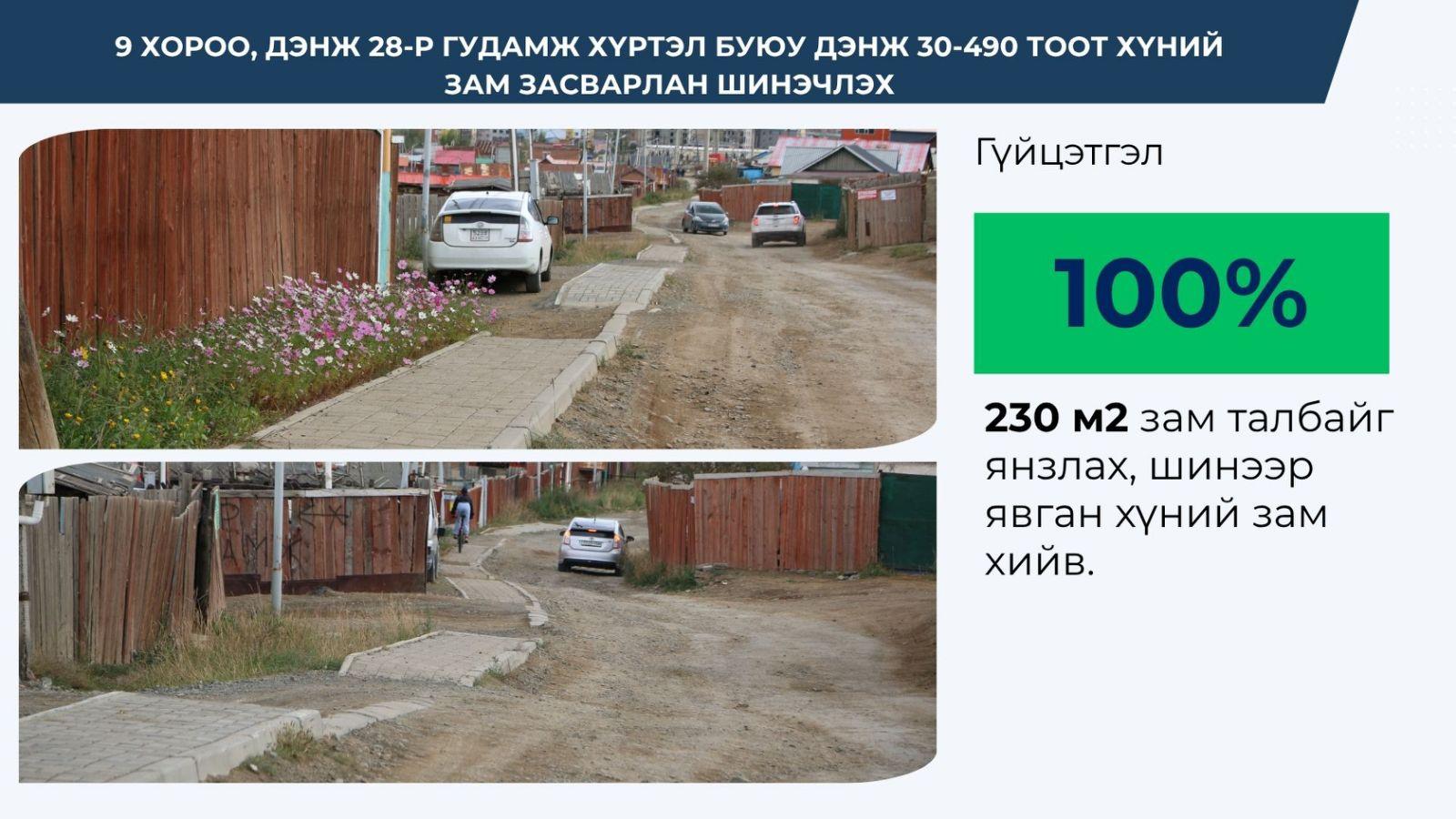 Энэхүү байршлаас гадна Чингэлтэй дүүргийн 7, 9, 20, 21 дүгээр хороодод хотын төвийн зам засвараас гарсан эвдрэл гэмтэлгүй хавтангуудаар явган зам талбай, шат хийж гүйцэтгэжээ. Ингэхдээ тухайн хорооны ажилтан, албан хаагч, хэсгийн ахлагч нараас явган хүн зорчиход хүндрэл бэрхшээл ихтэй хэсгүүдийн судалгааг авч нэн шаардлагатай байршлаас эхлэн тохижуулсан байна. Тухайлбал, 9 дүгээр хорооны Дэнж 28-р гудамжинд явган замын эвдрэлтэй хэсгийг нөхөж засварласан.