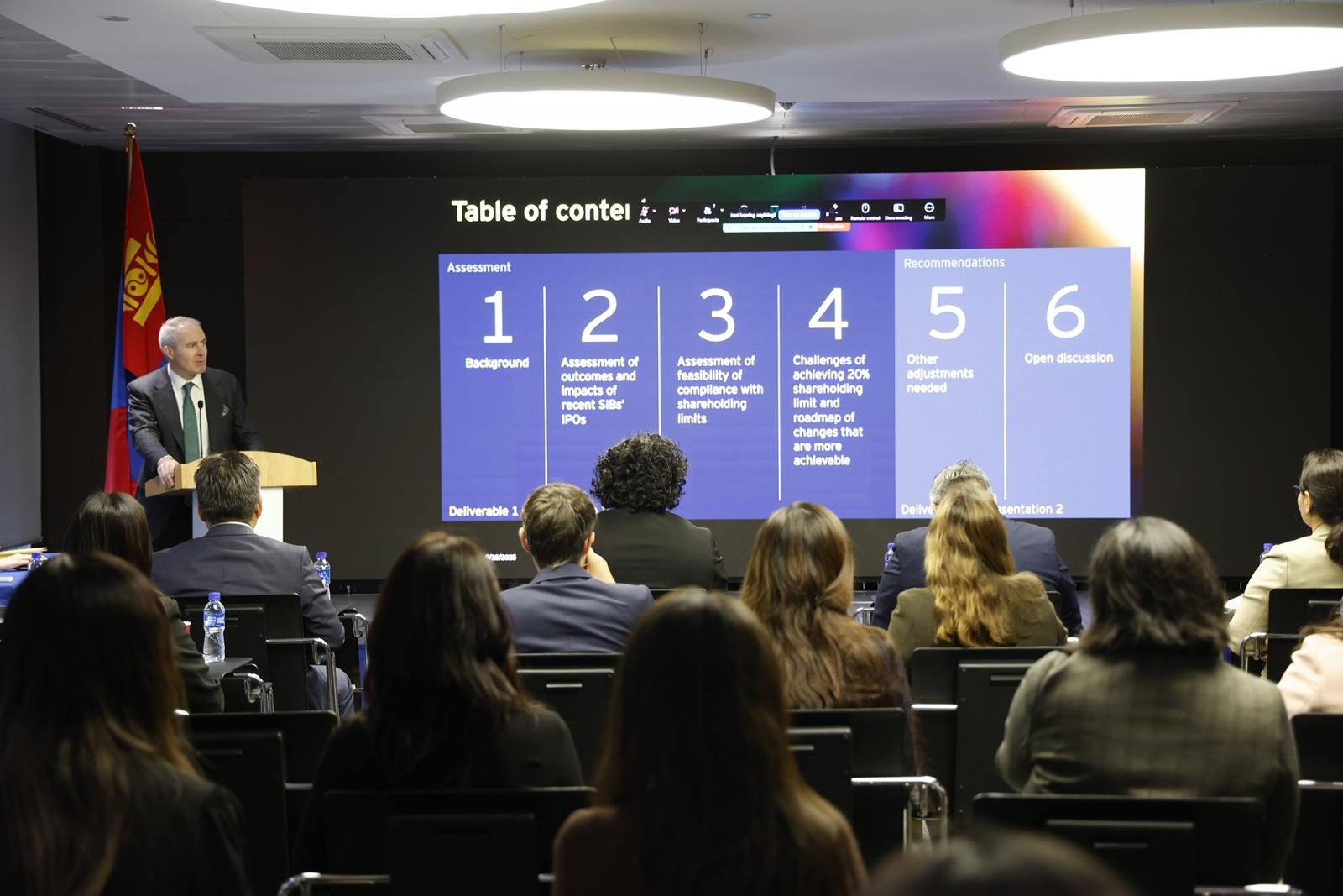 Тус судалгааны ажлын гүйцэтгэгчээр хөндлөнгийн, мэргэшсэн зөвлөх үйлчилгээний компани болох “Эрнст энд Янг” ажилласан бөгөөд судалгааны тайланд тусгасан онцлох асуудлууд болох хувьцаа эзэмшлийн төвлөрлийг бууруулах боломжит стратегиуд, хууль тогтоомжид оруулах өөрчлөлтийн талаарх санал болон судалгаанаас гарсан бусад үр дүнгийн талаар танилцууллаа.