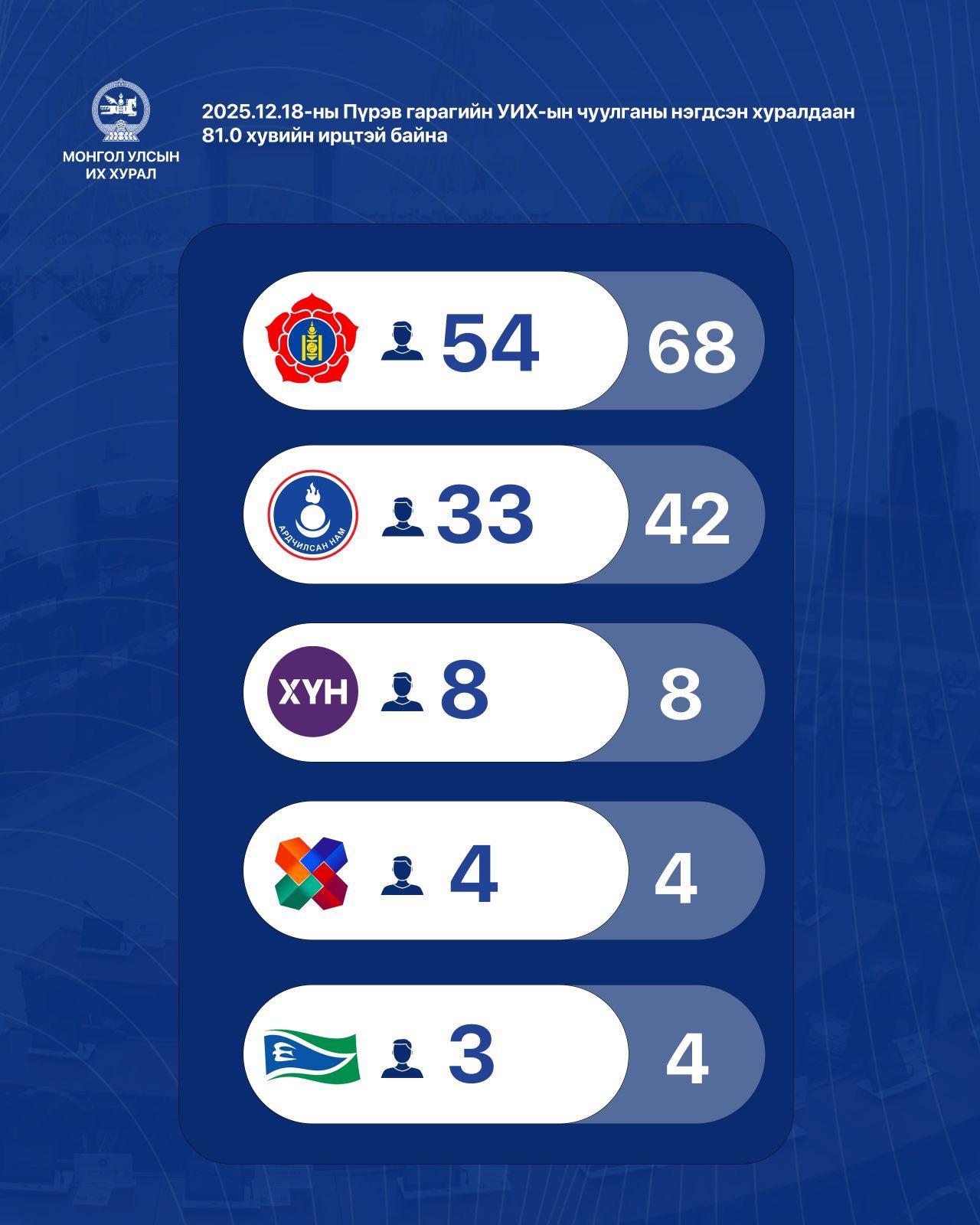 Өнөөдрийн чуулганы хуралдаан 126 гишүүн оролцох ёстойгоос 81 хувийн ирцтэйгээр үргэлжилж байна. Тухайлбал 4 гишүүн эмнэлгийн чөлөөтэй, 5 гишүүн эзгүй байгааг гэдэг ирцийн мэдээллийг УИХТГ-аас өглөө.