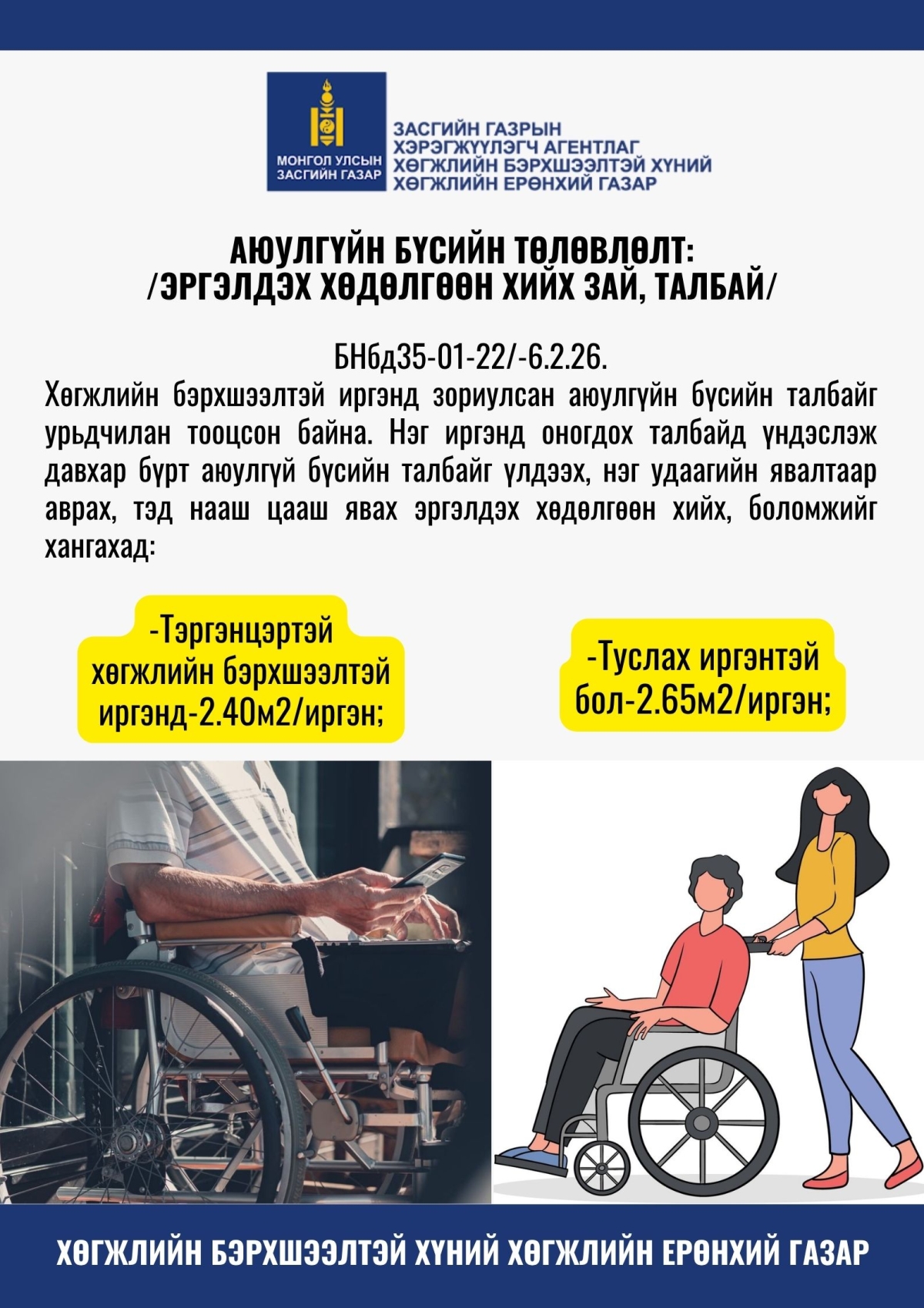 БНбд35-01-22/-6.2.26. Хөгжлийн бэрхшээлтэй иргэнд зориулсан аюулгүйн бүсийн талбайг урьдчилан тооцсон байна. Нэг иргэнд оногдох талбайд үндэслэж давхар бүрт аюулгүй бүсийн талбайг үлдээх, нэг удаагийн явалтаар аврах, тэд нааш цааш явах эргэлдэх хөдөлгөөн хийх, боломжийг хангахад: