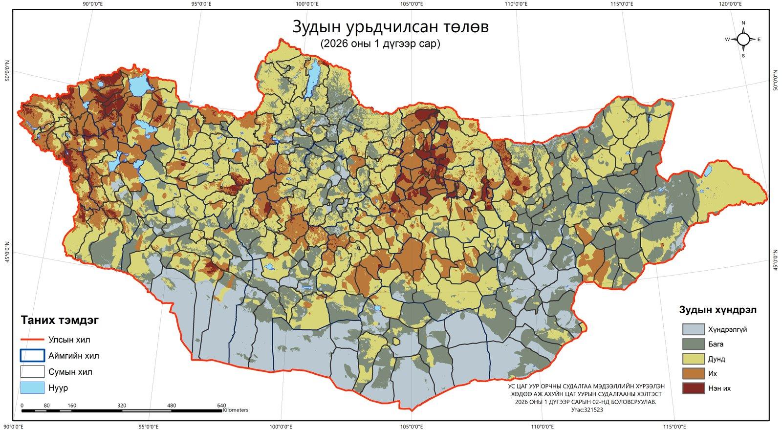 2026 оны нэгдүгээр сарын зудын урьдчилсан төлөвөөс харахад мал өвөлжилт нийт нутгийн 3%-д нэн их, 17%-д их, 38%-д дунд, 26%-д бага зэрэг хүндрэлтэй, харин 16%-д хүндрэлгүй байх төлөвтэй байгааг цаг уурын байгууллагаас мэдээллээ.