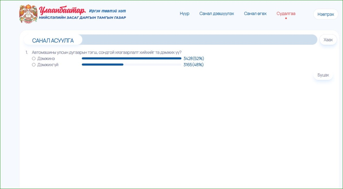Тус санал асуулга өнөөдөр 18:00 цагт дууссан бөгөөд нийт 6,593 иргэн оролцжээ. Санал асуулгад оролцогчдын 52 хувь нь автомашины улсын дугаарыг тэгш, сондгойгоор хөдөлгөөнд оролцуулахыг дэмжсэн байна гэж НЗДТГ-аас мэдээллээ. Харин санал асуулгад оролцогчдын 48 хувь нь дэмжээгүй. Гэвч санал асуулгад оролцсон иргэдийн тоо нь Улаанбаатар хотын албан ёсны хүн амын дөнгөж 0.4 хувьтай тэнцэж байна. Энэ нь олон нийтийн саналыг төлөөлөхгүй хэмээн зарим иргэд шүүмжилж эхэлсэн.