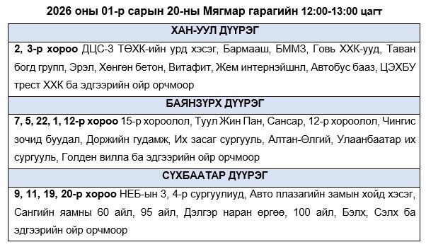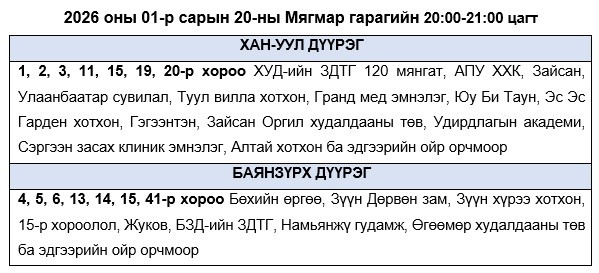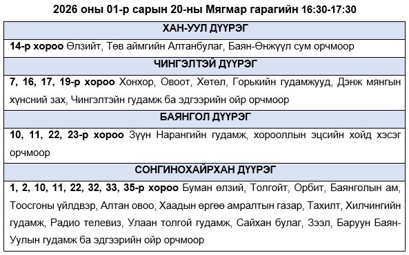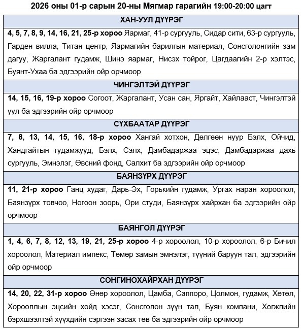 Эрчим хүчний чадлын дутагдлаас шалтгаалан 2026 оны 01-р сарын 20-ны Мягмар гарагт хязгаарлалт хийж “БОЛЗОШГҮЙ” байршлуудын хуваарийг УБЦТС ТӨХКС-иас танилцууллаа.