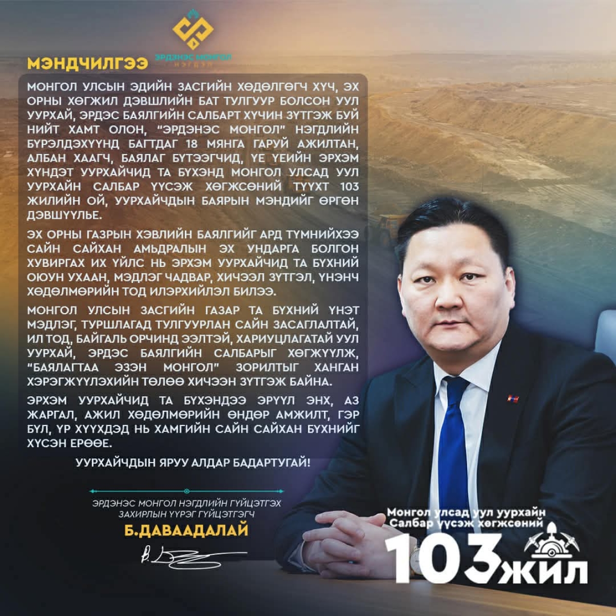 🔰Монгол Улсын эдийн засгийн хөдөлгөгч хүч, эх орны хөгжил дэвшлийн бат тулгуур болсон уул уурхай, эрдэс баялгийн салбарт хүчин зүтгэж буй нийт хамт олон, “Эрдэнэс Монгол” нэгдлийн бүрэлдэхүүнд багтдаг 18 мянга гаруй ажилтан, албан хаагч, баялаг бүтээгчид, үе үеийн эрхэм хүндэт уурхайчид Та бүхэнд Монгол Улсад уул уурхайн салбар үүсэж хөгжсөний түүхт 103 жилийн ой, Уурхайчдын баярын мэндийг өргөн дэвшүүлье.