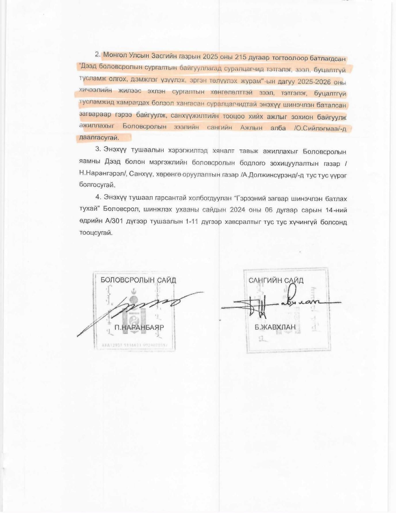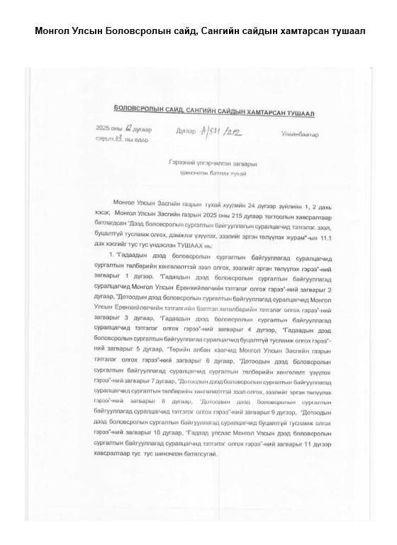 Иймд 2024-2025 оны хичээлийн жилд болзол, нөхцөлөө ханган шалгаруулалтад тэнцсэн дээрх оюутан суралцагчдын эрх, хууль ёсны ашиг сонирхлыг дордуулахгүй байх үүднээс өмнөх оны сонгон шалгаруулалтын явцад суралцагчдад урьдчилан танилцуулаагүй гэрээний нөхцөлийг тулгаж шийдвэрлэх нь эрх зүйн хувьд зөрчилтэй юм. Боловсролын сайд, Сангийн сайдын хамтарсан “Гэрээний үлгэрчилсэн загварыг шинэчлэн батлах тухай” А/571/212 тушаалын 2 дахь заалтыг үндэслэн холбогдох гэрээг суралцагчдын асран хамгаалагч, батлан даагчидтай өнөөдөр байгуулсан болно.