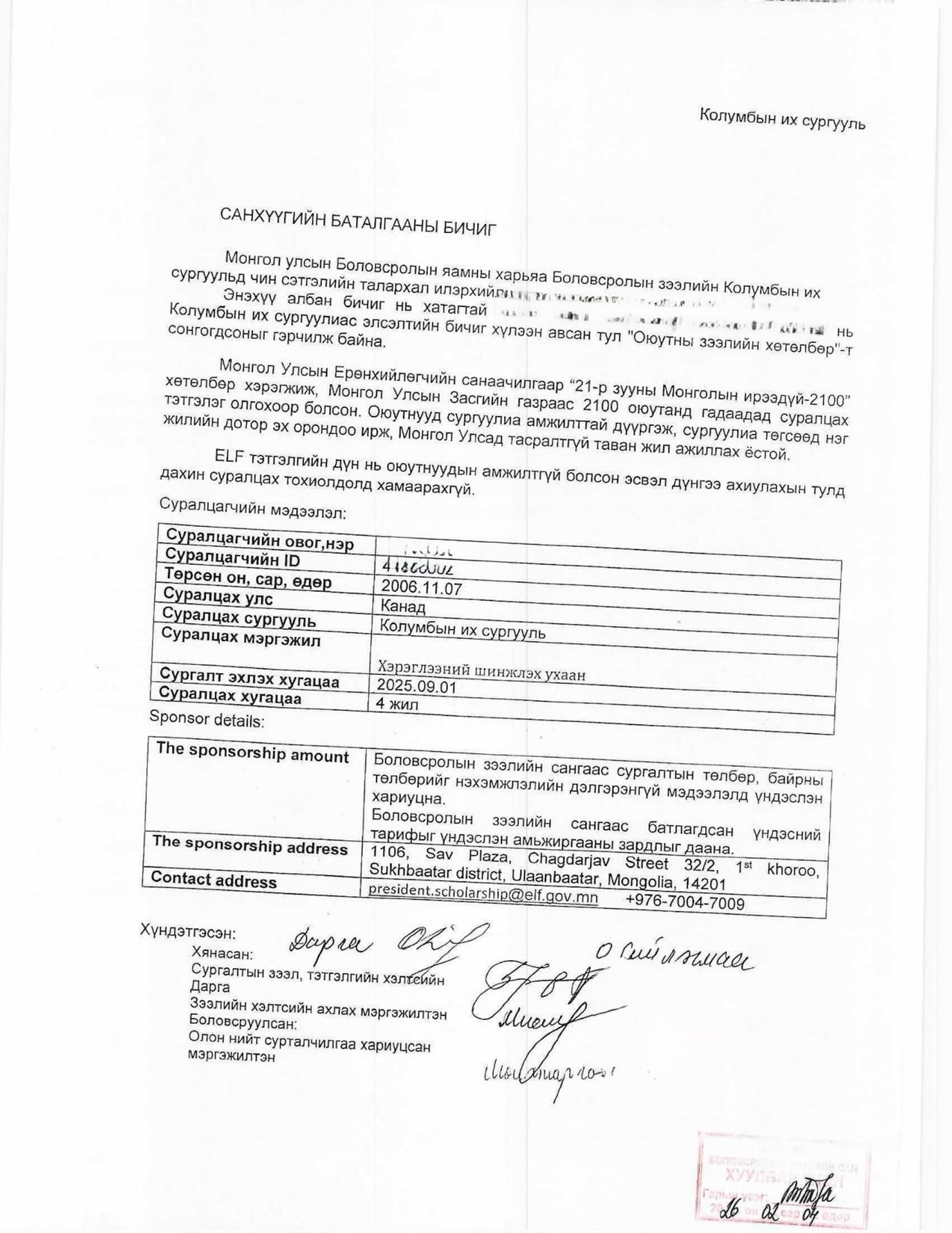 Энэхүү санхүүжилтийн баталгааны бичиг нь тухайн суралцагчдыг албан бичигт дурдагдсан их сургуульд суралцах хугацаанд холбогдох зардлыг даахыг баталгаажуулах зорилготой юм. (Илгээлт 2100 хөтөлбөр, Боловсролын зээлийн сангийн зээлээр суралцах бичгийг хавсаргав.)
