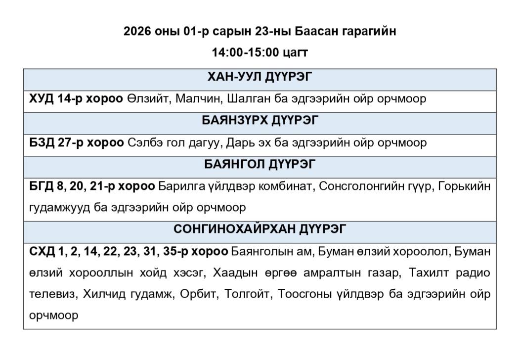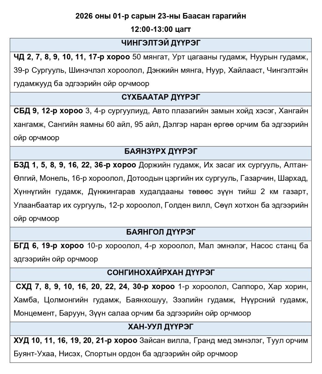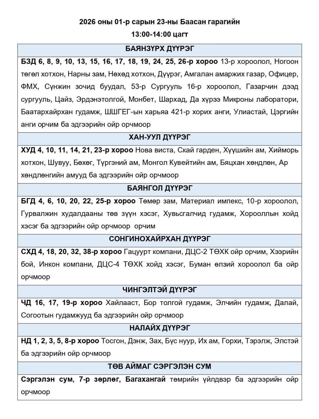 Эрчим хүчний системд аваарын горим үүсэхээс сэргийлэн нийслэлийн хэмжээнд тодорхой байршлуудад цахилгаан эрчим хүчний төлөвлөсөн хэрэглээг “Диспетчерийн үндэсний төв” ТӨХХК-ийн шийдвэрээр хуваарийн дагуу 1-ээс 1 цаг 30 минутын хугацаатайгаар хязгаарлах арга хэмжээ авч байна. Гэхдээ нийслэлийн эрчим хүчний хэрэглээний ачааллын өсөлтөөс шалтгаалан зарласан зарим цагийн хуваарьт өөрчлөлт орж байна.